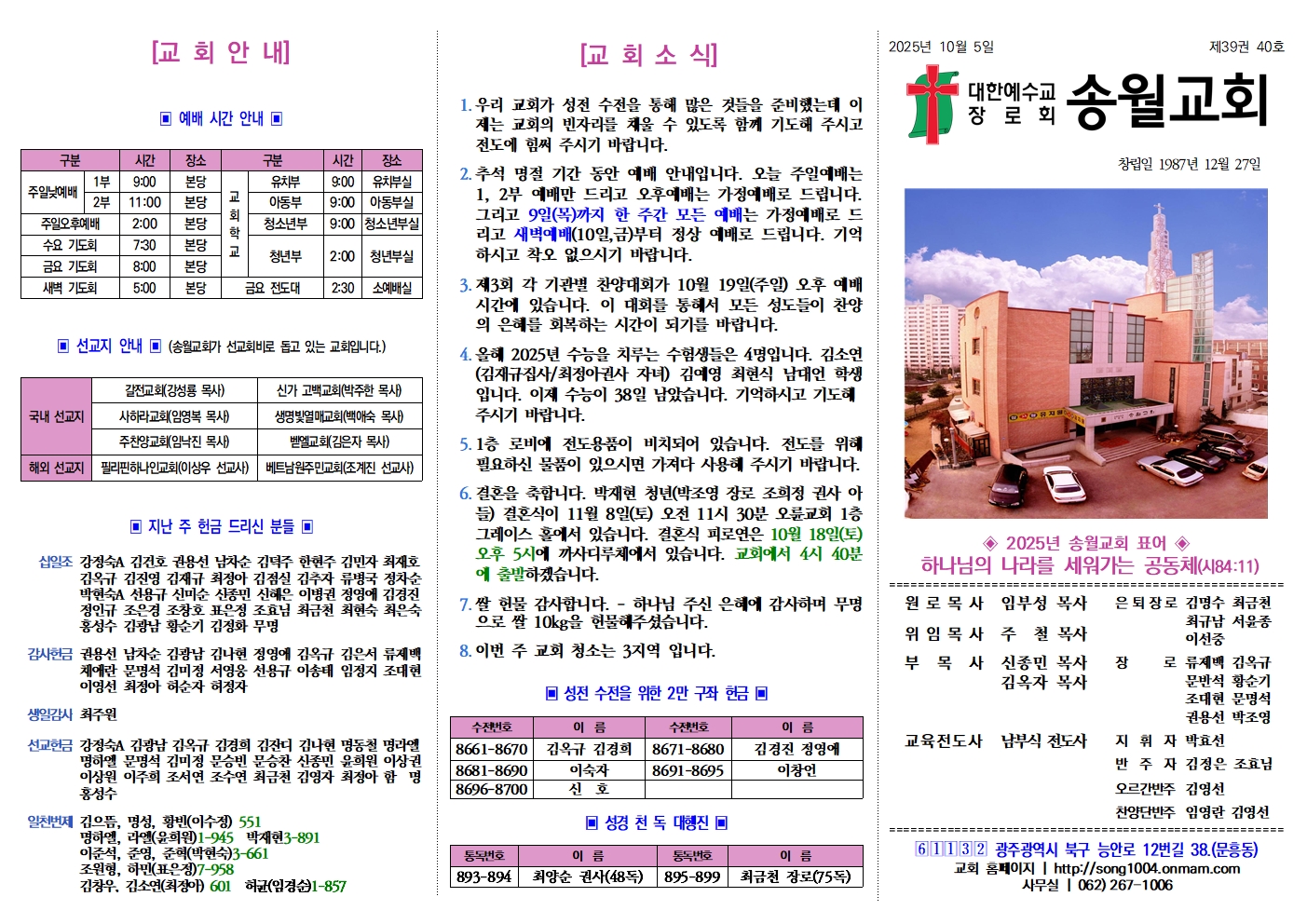 2025년 10월 5일 교회소식 및 주보